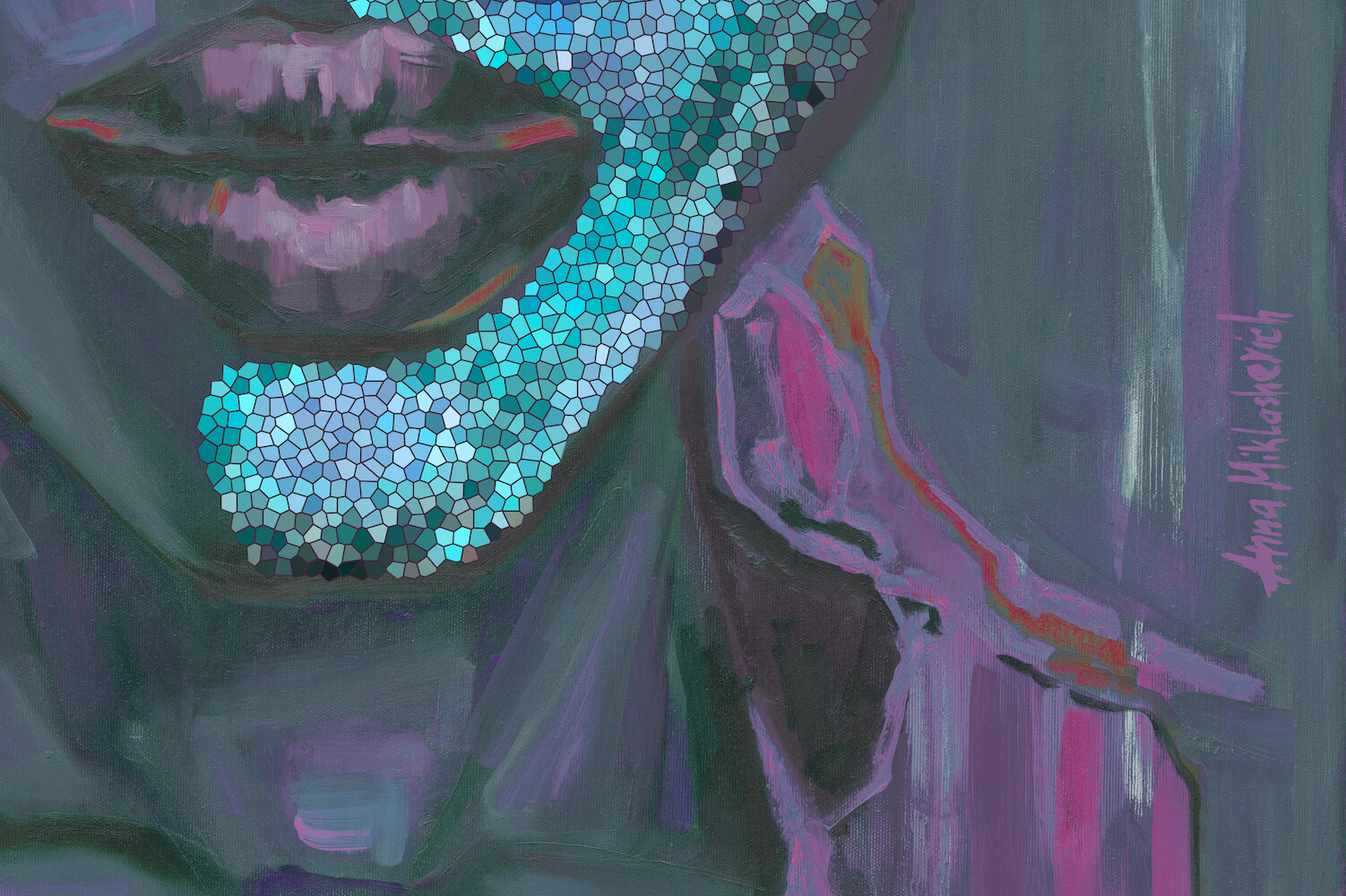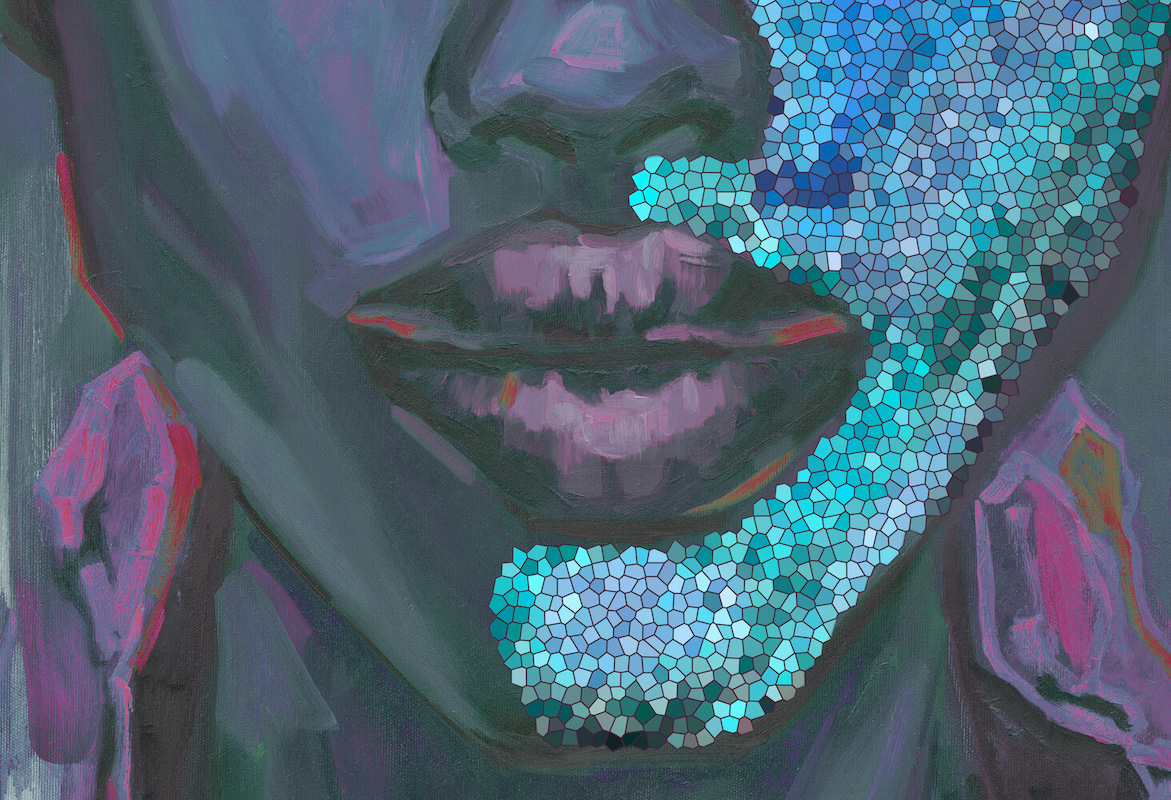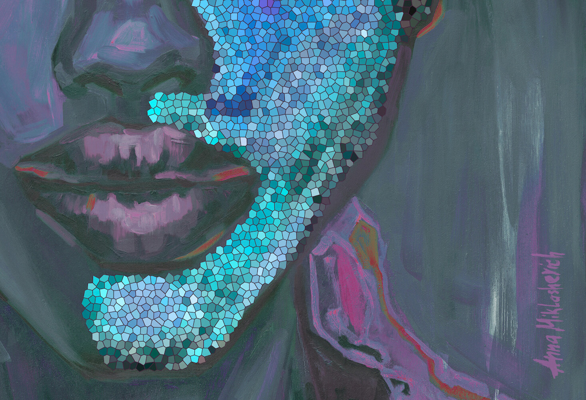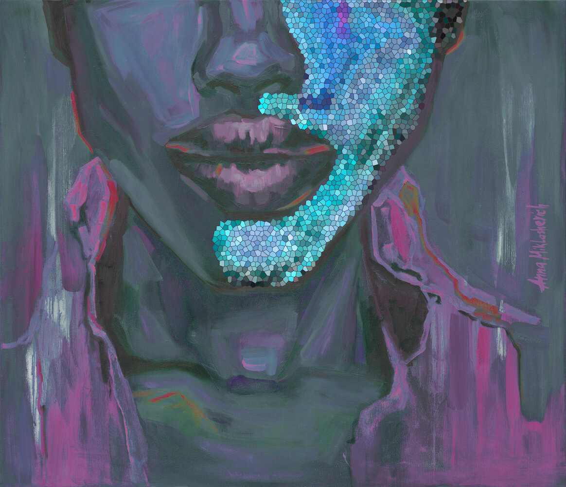Cool greens and blues merge with layered purples, creating a calm yet concentrated atmosphere. The tension in the neck and jaw suggests alertness, readiness, and control — not softness, but steadiness. She is not relaxed; she is focused.