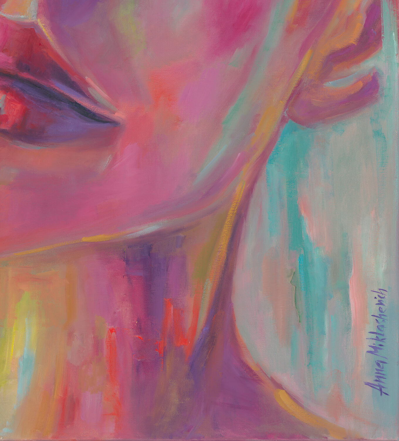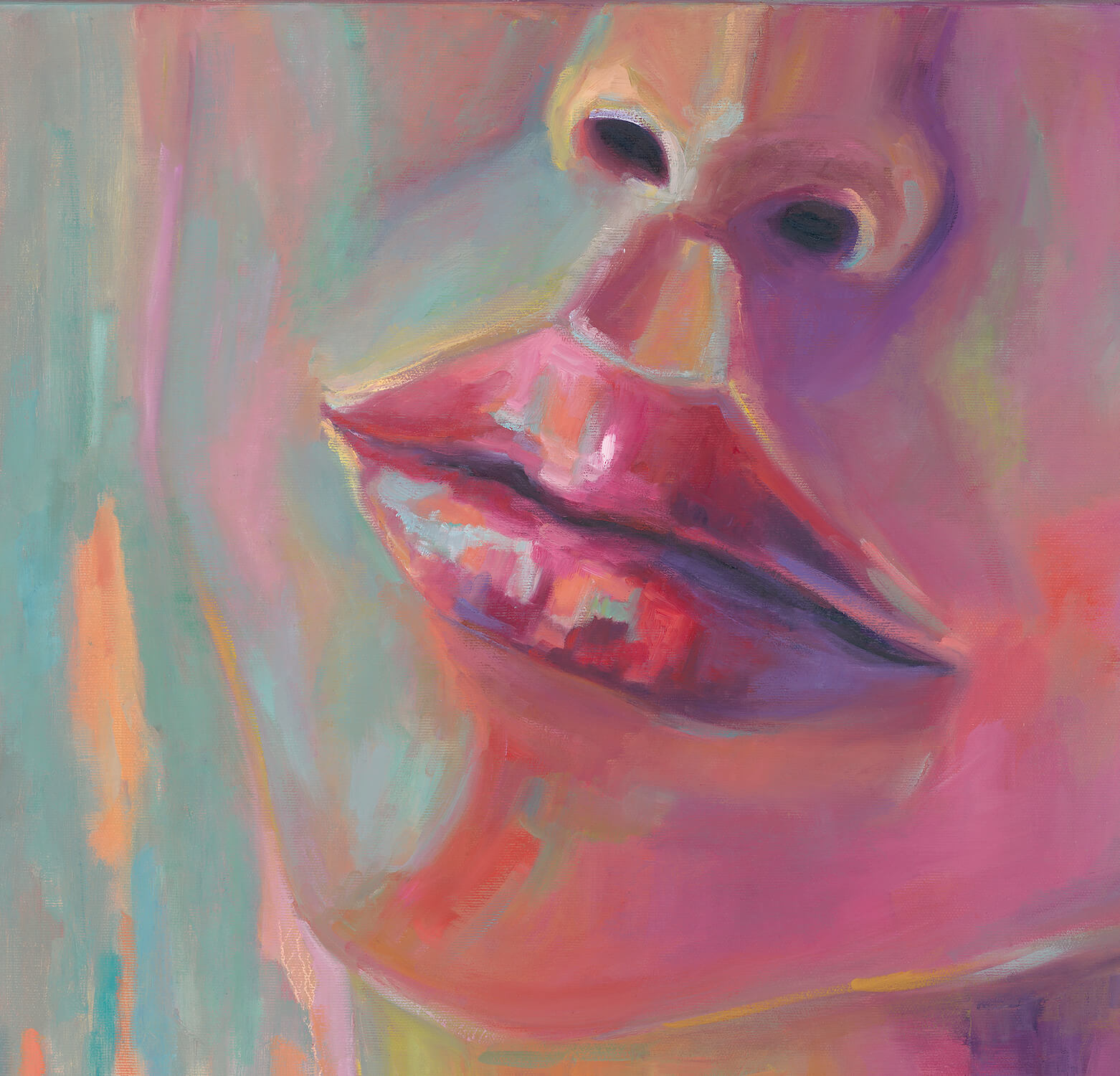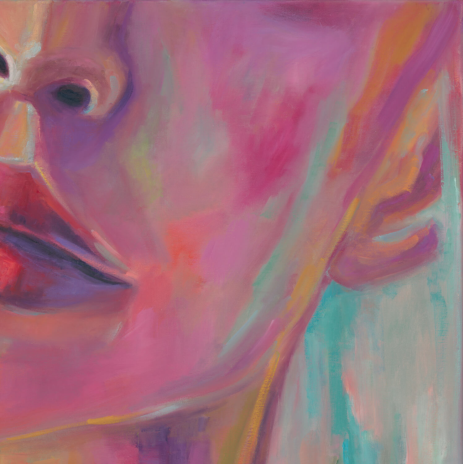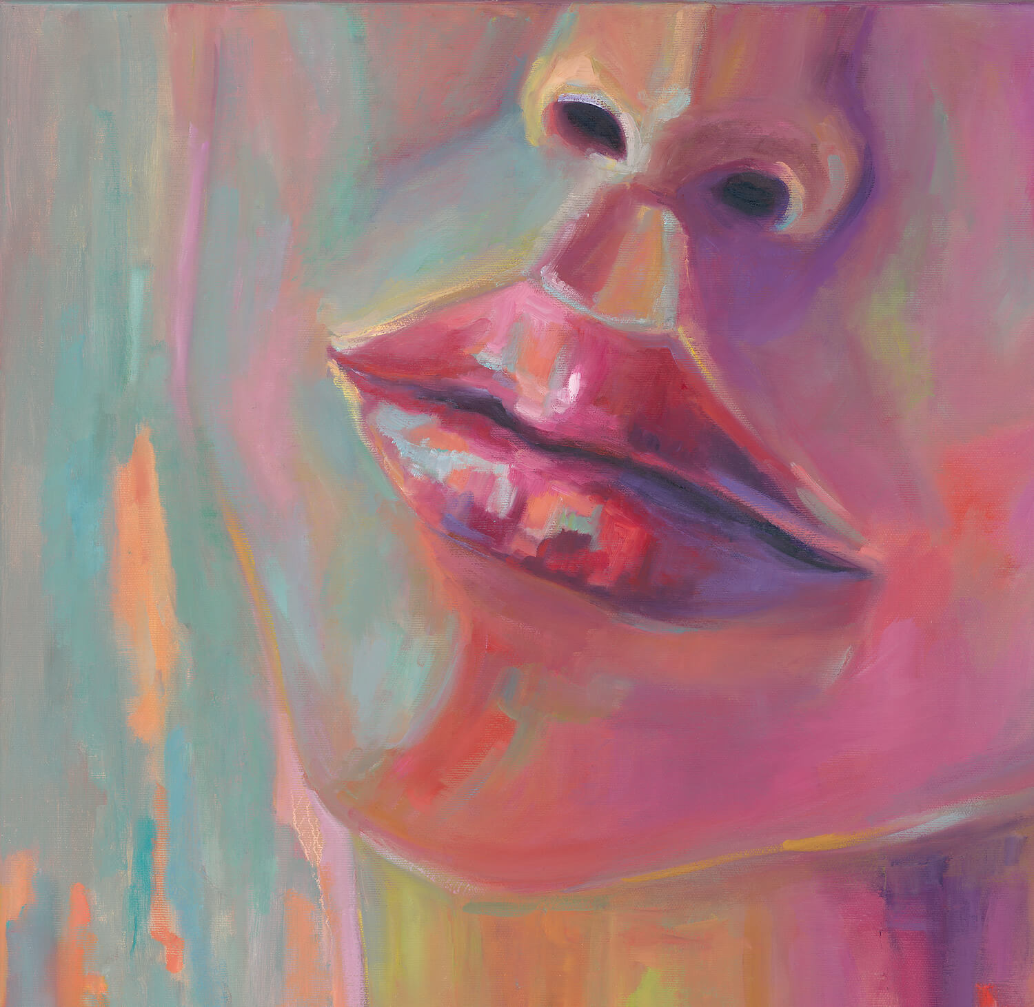 This close-up portrait of a young woman’s face highlights the nose and lips, offering an abstract interpretation that fuses impressionism with expressionism. Created with oil paints in soothing, optimistic colors, the dominant shades are gentle pink, orange, and touches of turquoise.
