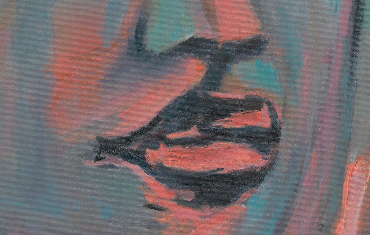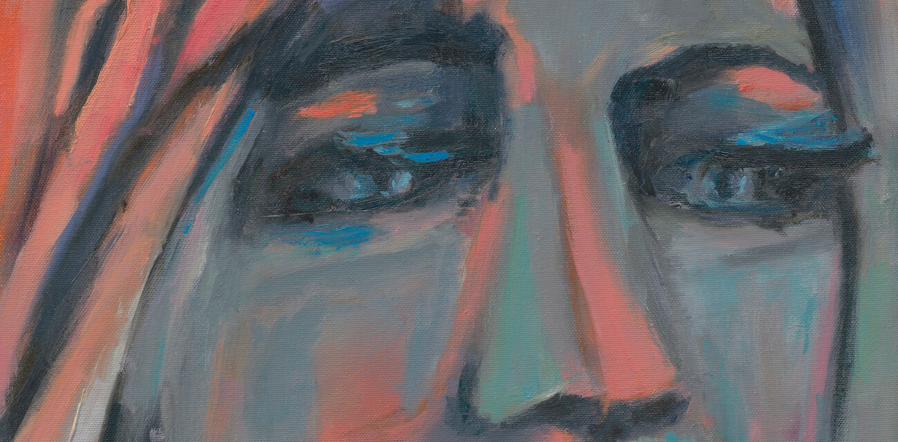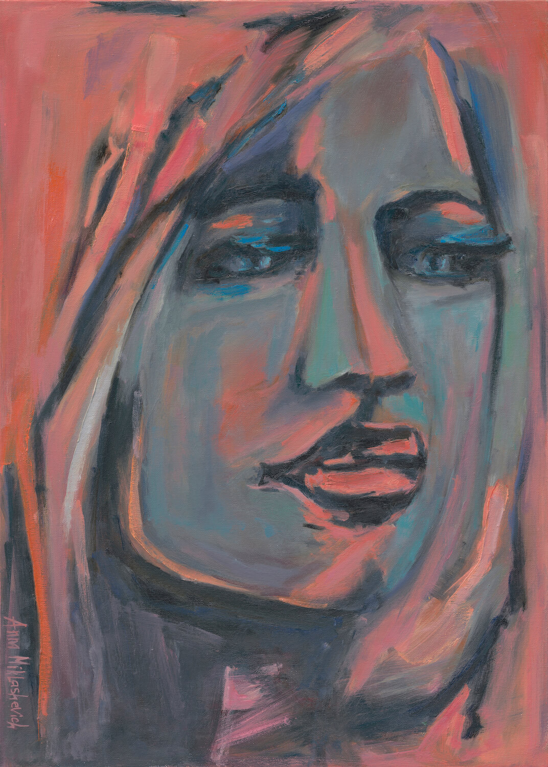 A medium vertical giclée art print featuring a calm, commanding abstract woman in soft persimmon-red tones. Elegant, fashion-inspired wall art.