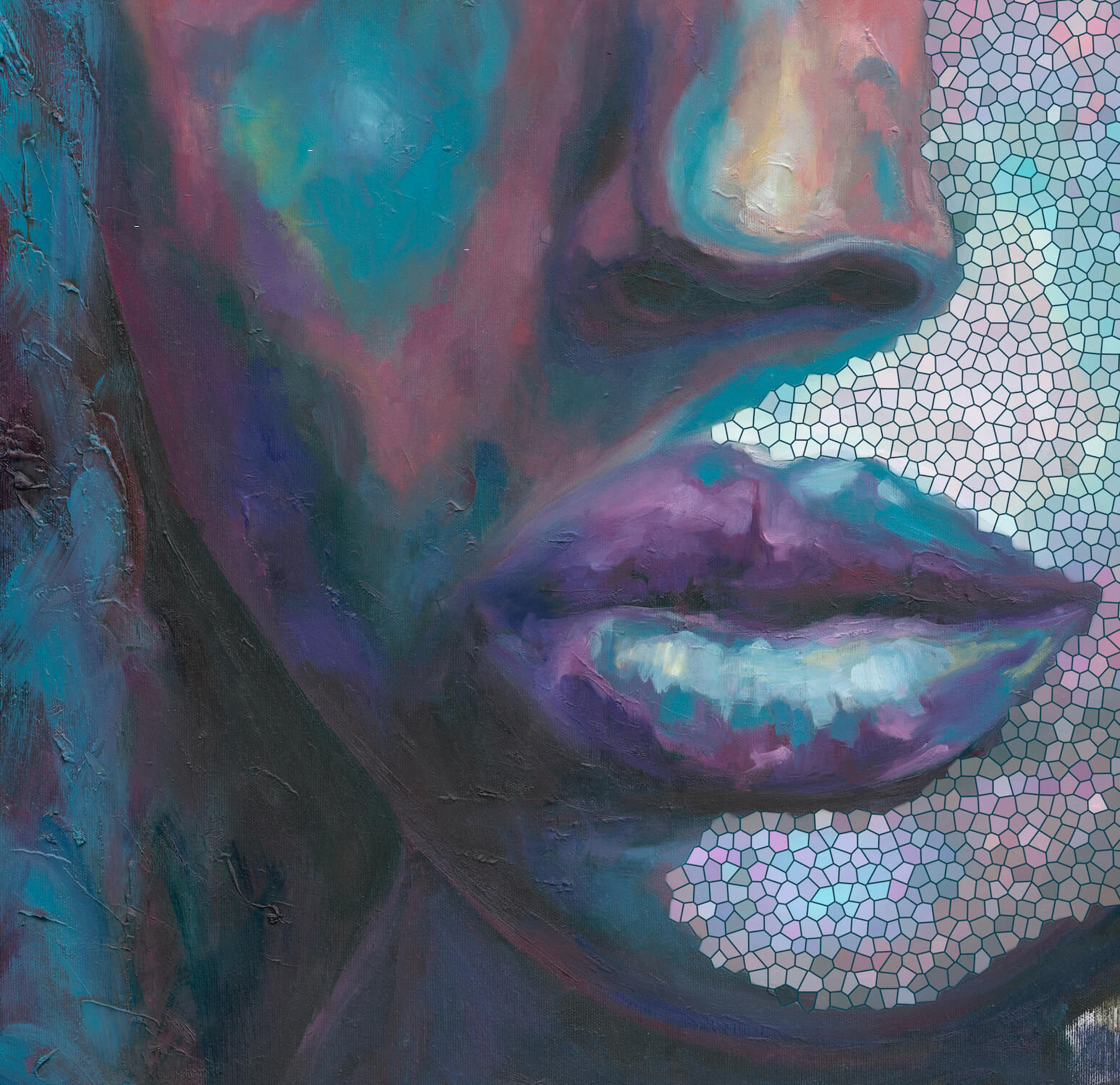 A luminous Black woman portrait art print in teal, blue, and soft silver tones, celebrating inner freedom, calm confidence, and self-acceptance.