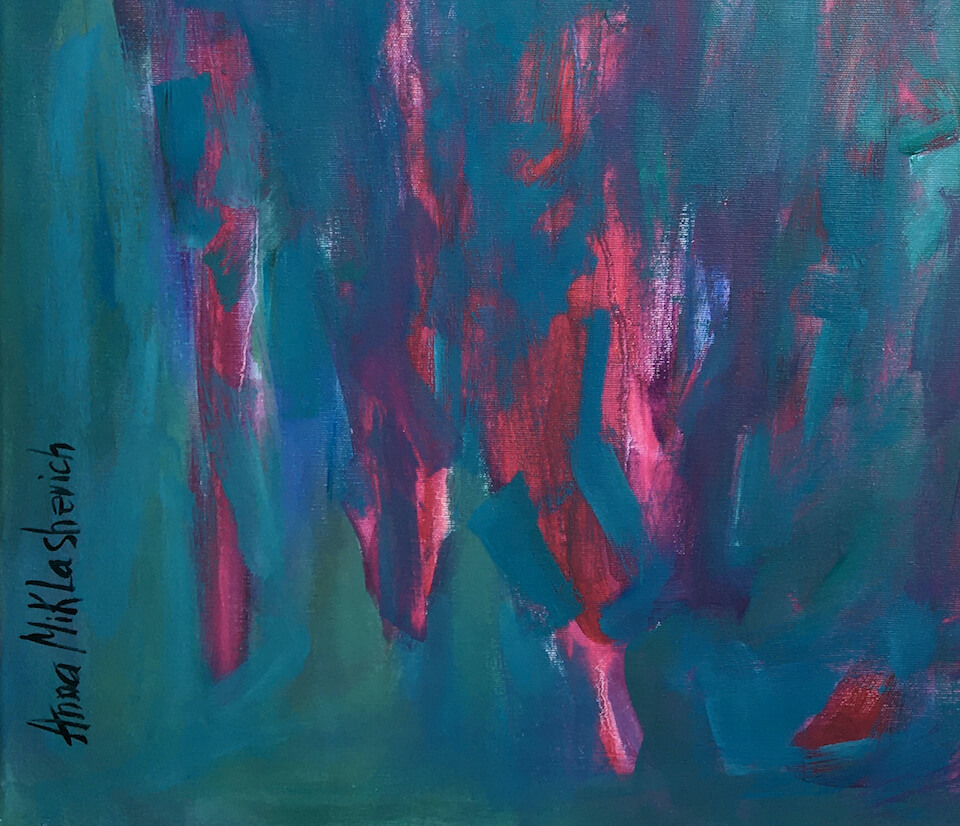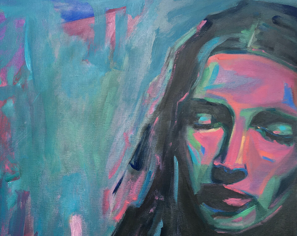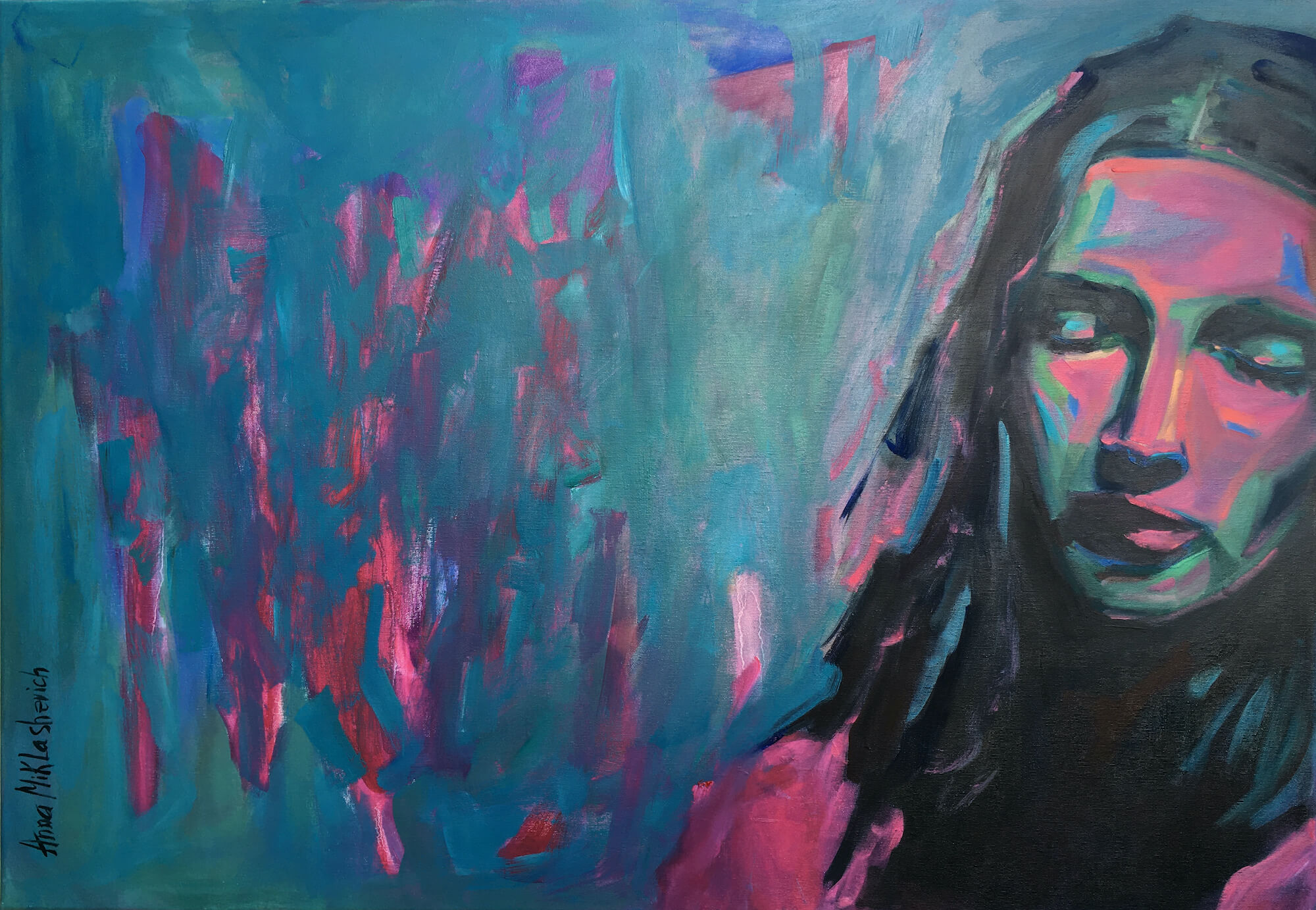 Integrated is a large-scale original oil painting (70 × 100 cm) exploring independence, belonging, and inner wholeness. This contemporary portrait portrays a woman who integrates strength and openness — becoming part of the whole without losing herself.